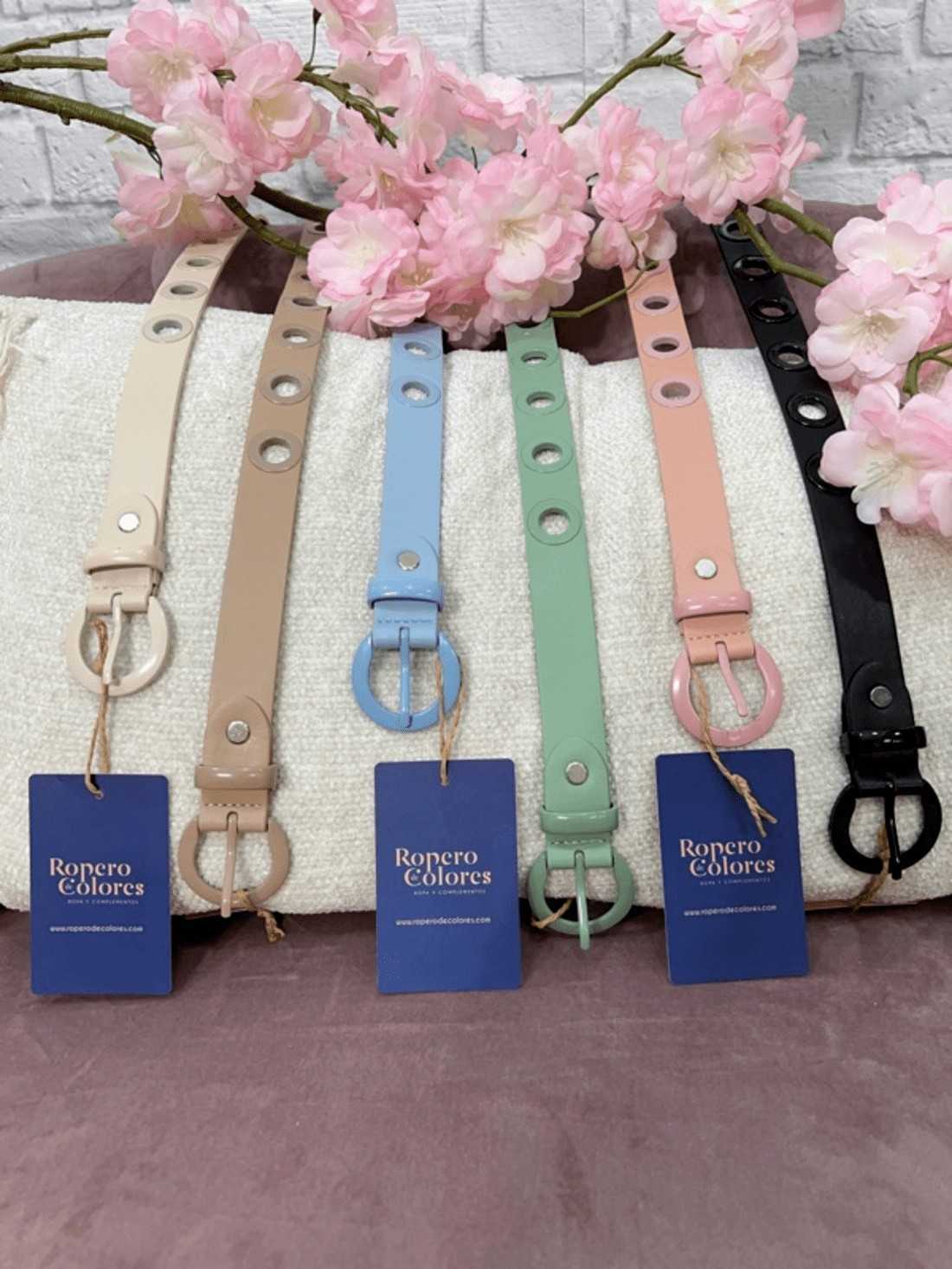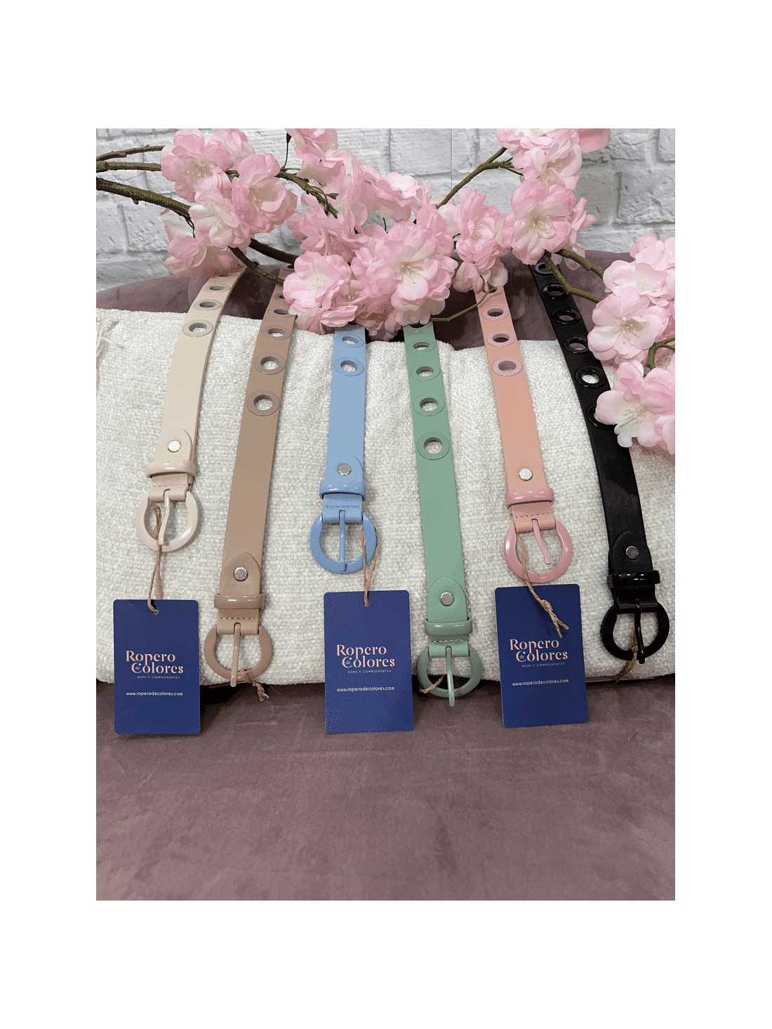 Cinturón con hebilla redonda de metal del mismo color que el cinturón. Lleva agujeros redondos con el filo de metal igual que la hebilla.