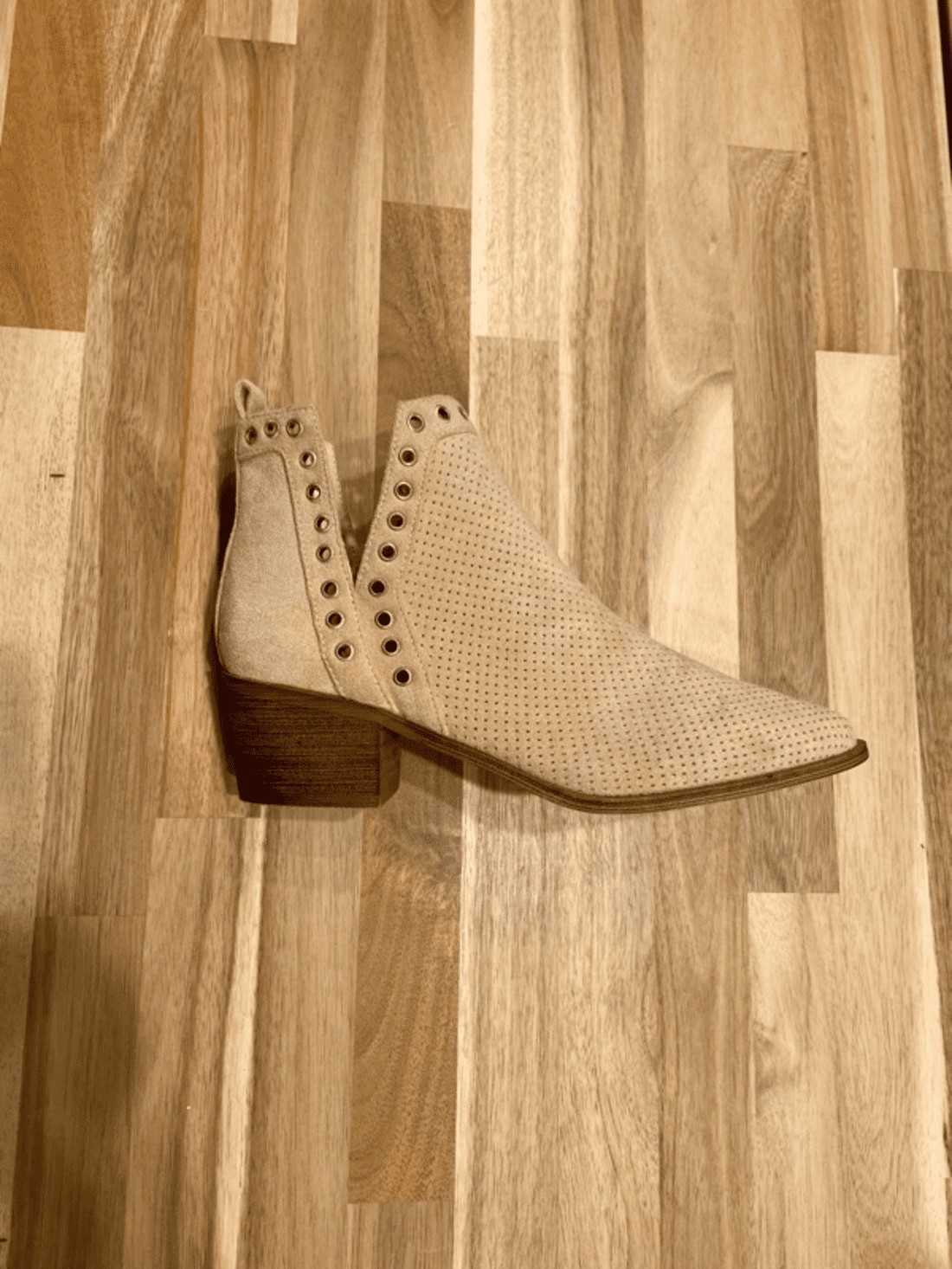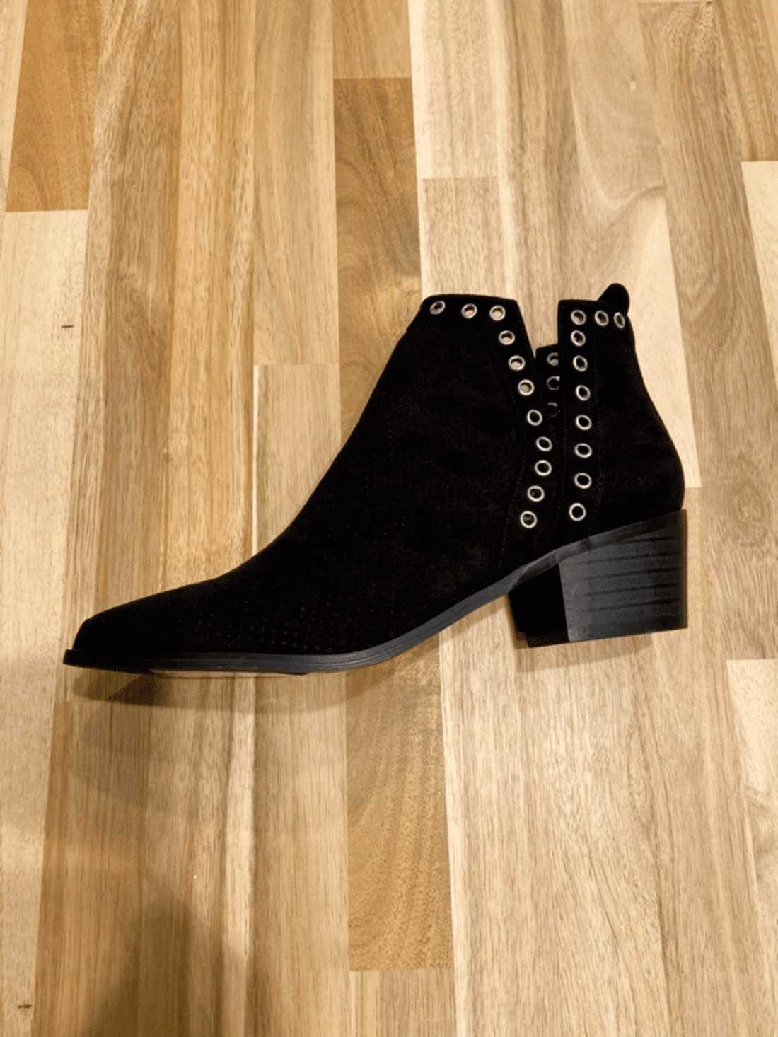 Botín básico de poco tacón con aberturas a los lados y tachuelas redondas en el filo