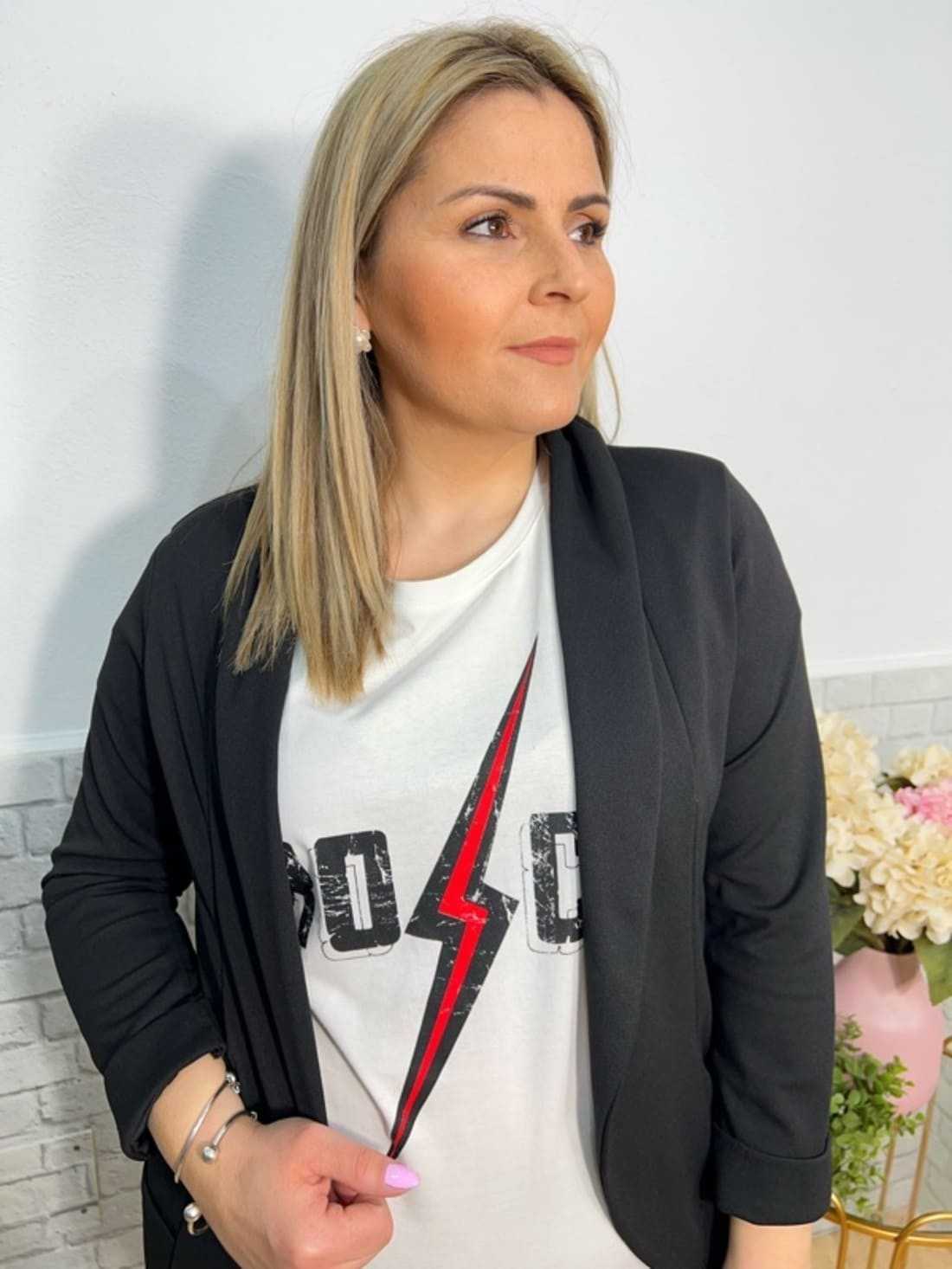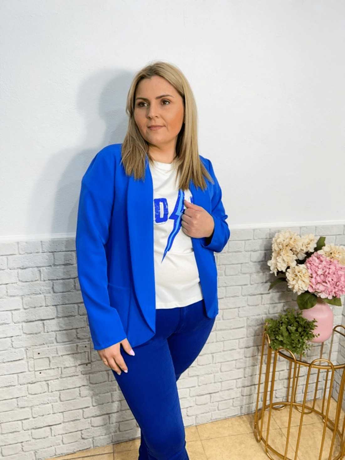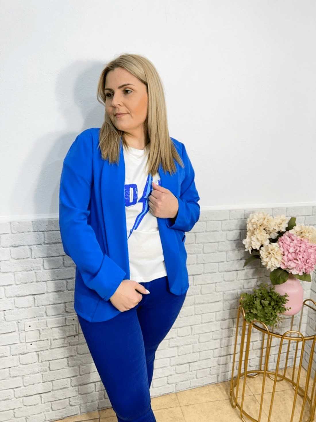 Blazer de manga larga sin cierres con dos bolsillos en la parte delantera. No lleva forro.