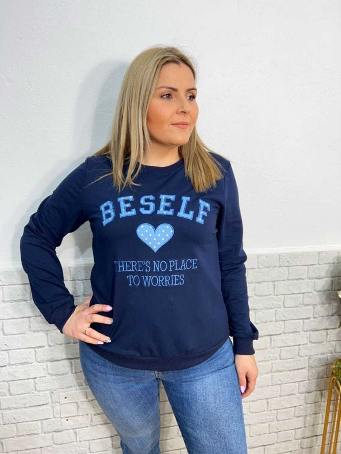 Sudadera de manga larga y cuello redondo con detalle de letras en el pecho (Beself ) y un corazón de tela de lunares y los filos bordados.